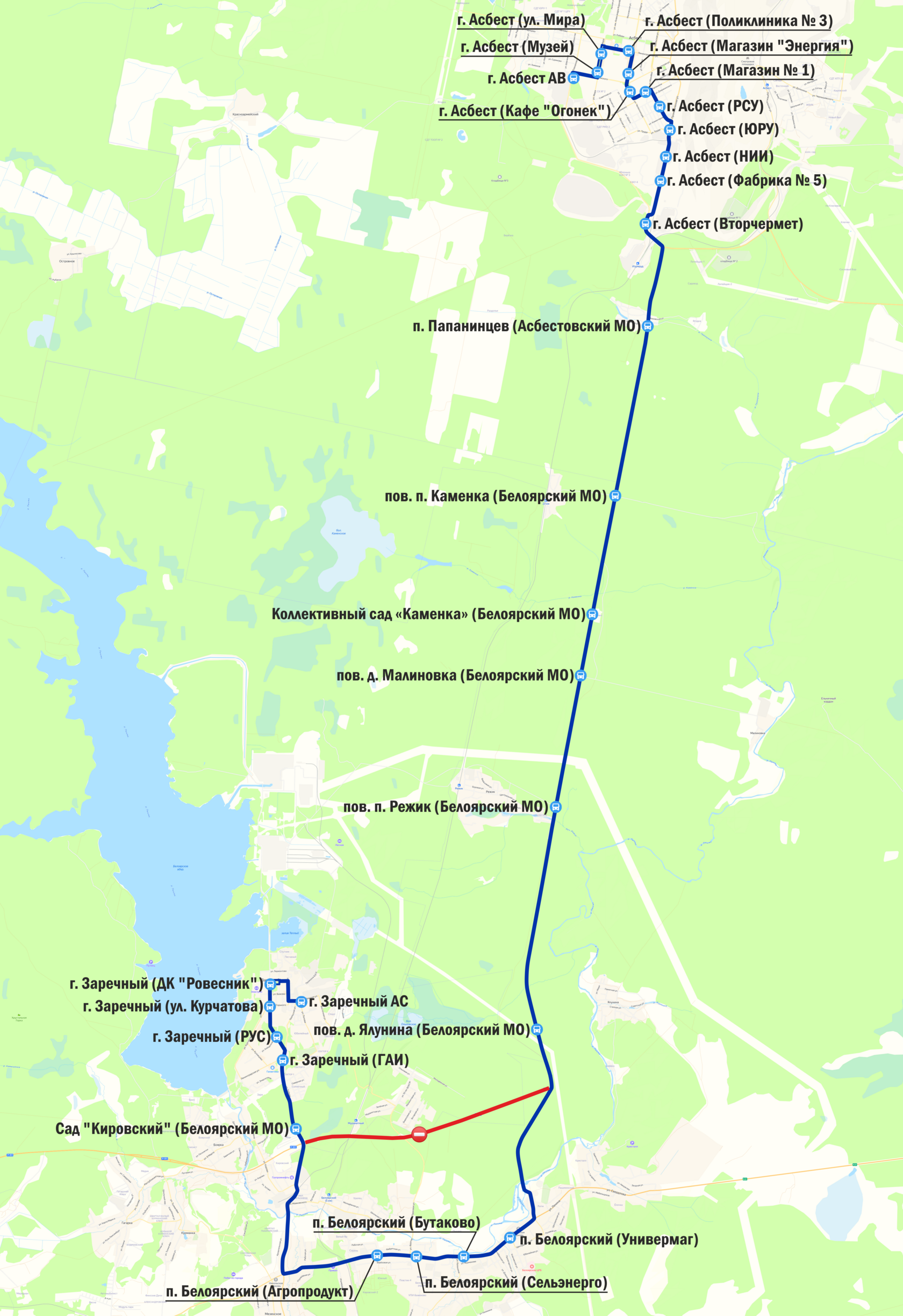 В связи с этим в межмуниципальный маршрут № 105 «г. Асбест АВ – г. Заречный АС» вносятся изменения в части пути следования транспортных средств и состава остановочный пунктов.