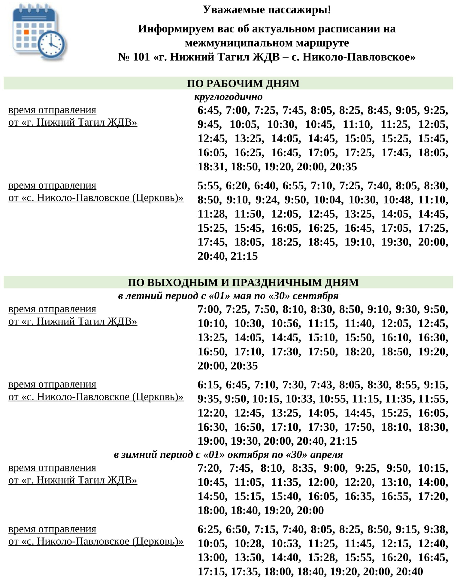 Актуальное расписание на межмуниципальном маршруте № 101 «г. Нижний Тагил ЖДВ – с. Николо-Павловское»