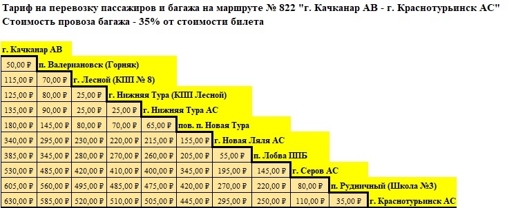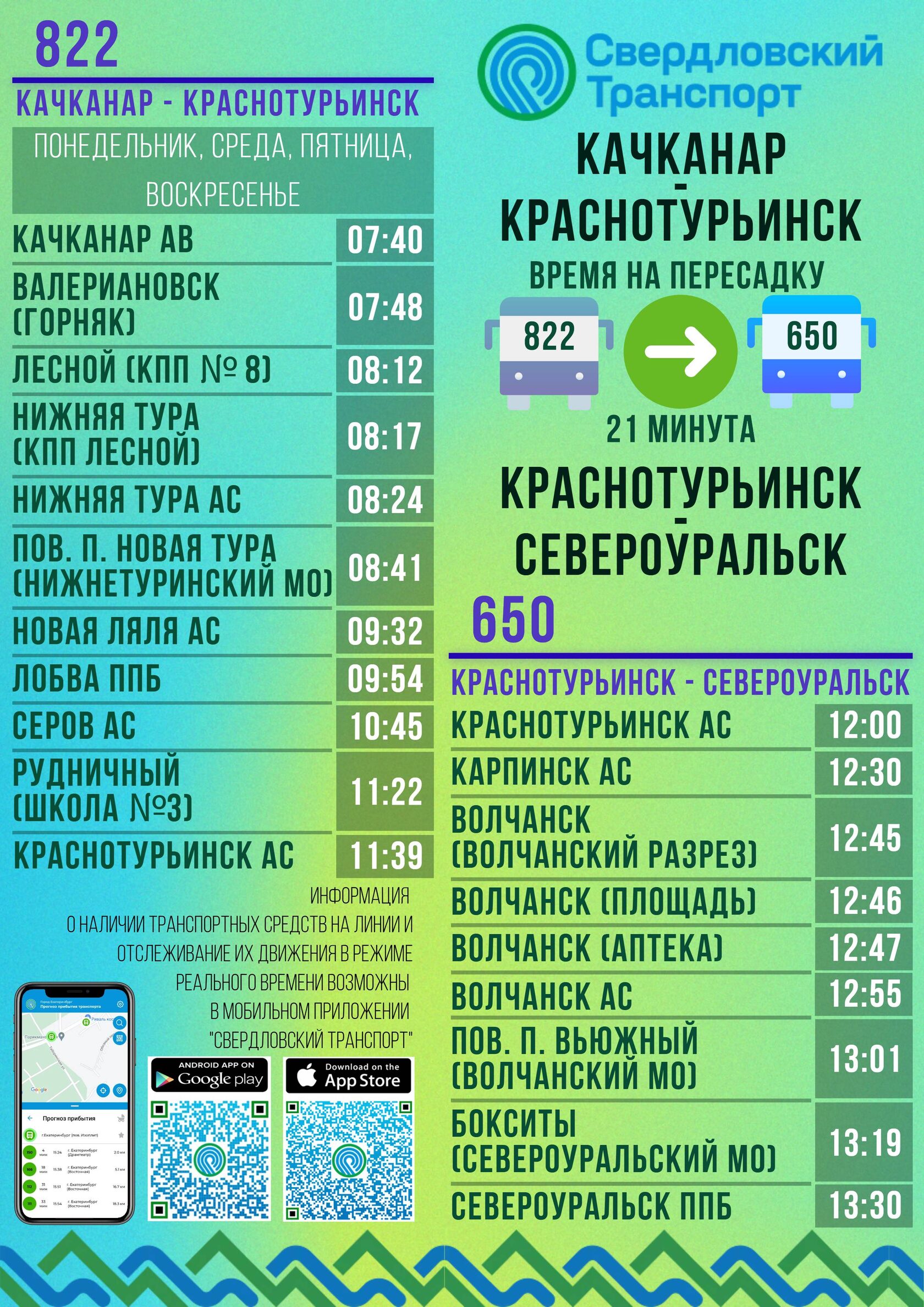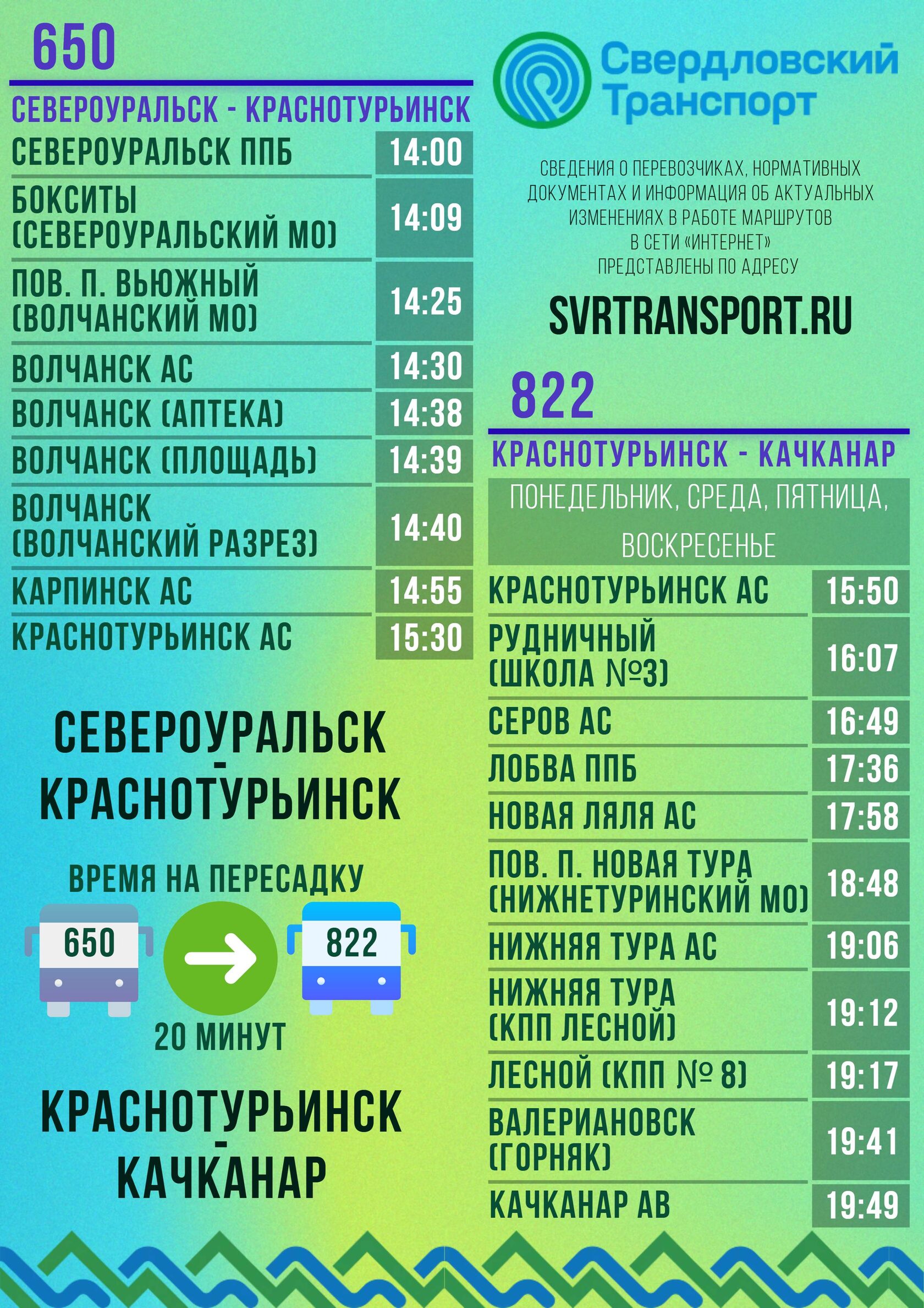 Расписание на маршруте № 822 согласовано с расписанием на межмуниципальном маршруте № 650 «г. Краснотурьинск АС - г. Североуральск ППБ» и пассажиры, следующие далее в направлении г. Карпинска, г. Волчанска и г. Североуральска, а также в обратном направлении, смогут совершить пересадку на автостанции г. Краснотурьинска.