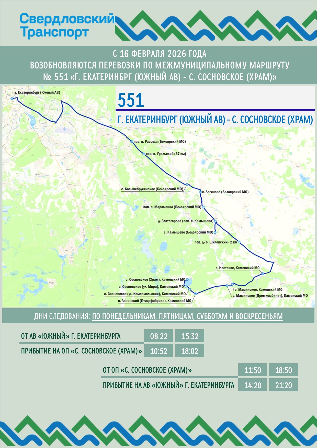 С 16 февраля возобновляются перевозки по межмуниципальному маршруту № 551 «г. Екатеринбург (Южный АВ) - с. Сосновское (Храм)»